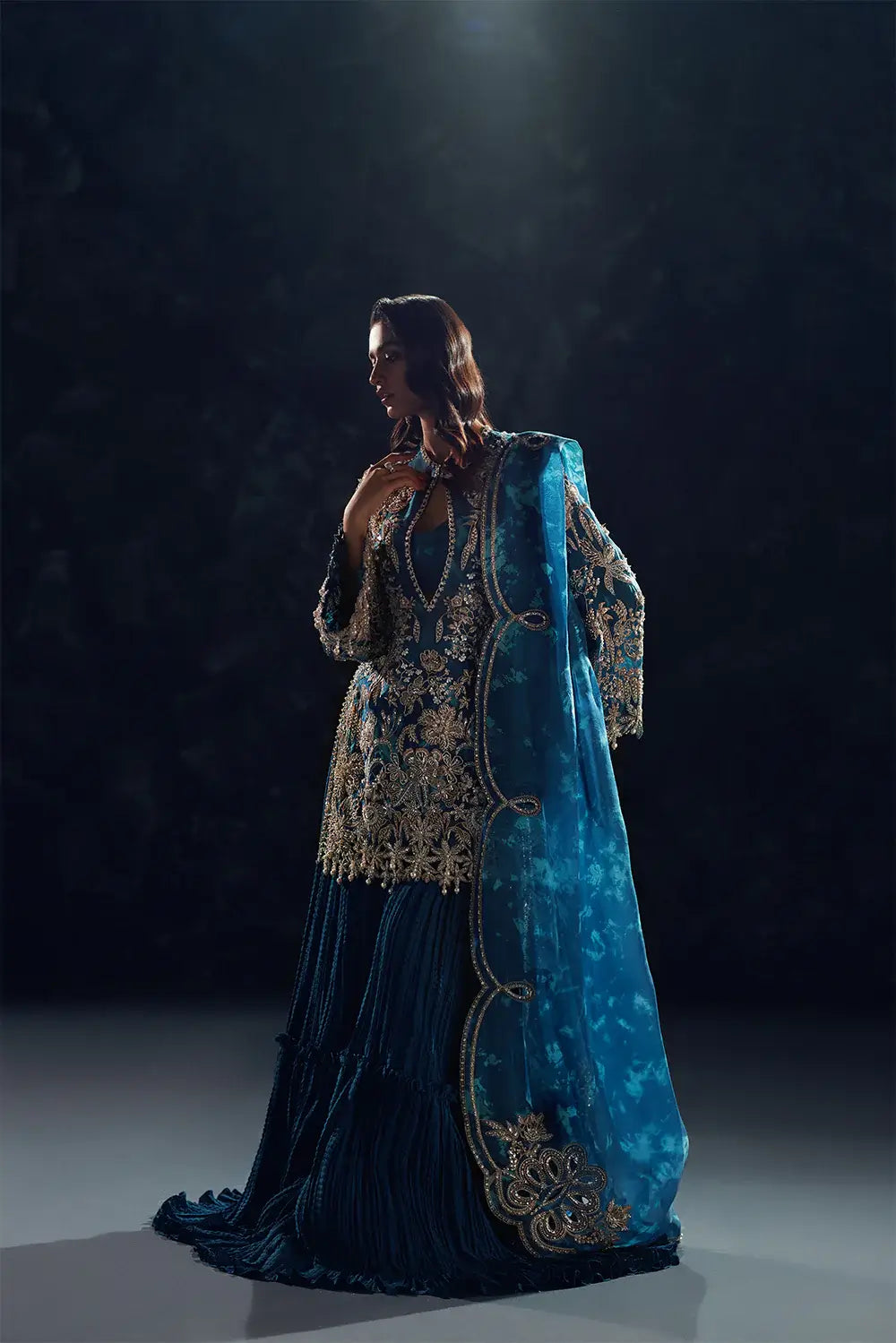 Serenity an enchanting deep navy tie and dye organza silhouette showcases intricate dabka, 3D floral motifs and delicate embroidery. A perfect contemporary take on traditional wear, with a structured bodice that accentuates the waist paired with crushed sharara pants. The flowing organza fabric of the dupatta with a delicate edging details create a rich and artistic outfit.