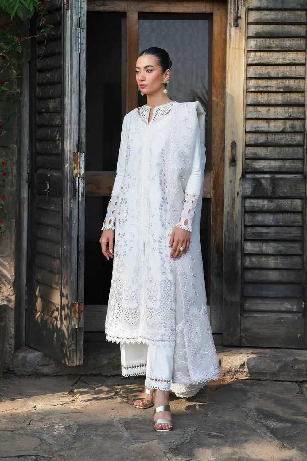 Crafted from the whisper of self-textured lawn, Fyka is a symphony of purity. The billowing organza dupatta, a weightless drape to the crisp cambric lawn pants, and delicate cutwork details at the hem and neckline echo the melody, while embroidered textures on the sleeves add a touch of playful harmony. This is a dress for the woman who moves with quiet grace, an evershining composition in white, perfect for twirling through moonlit gardens.