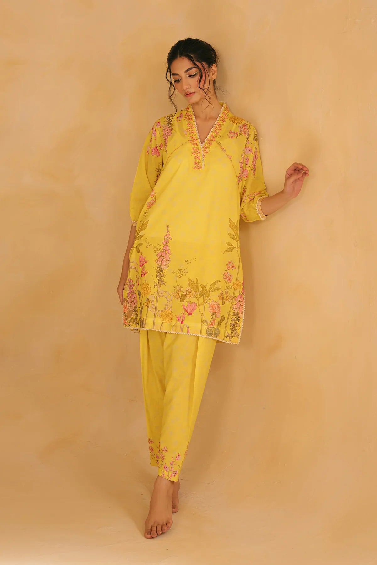This vibrant yellow matching set features a tunic with delicate floral prints cascading along the neckline and sleeves, while subtle lace accents enhance its charm. Paired with tailored, straight-leg pants that echo the intricate details of the top.