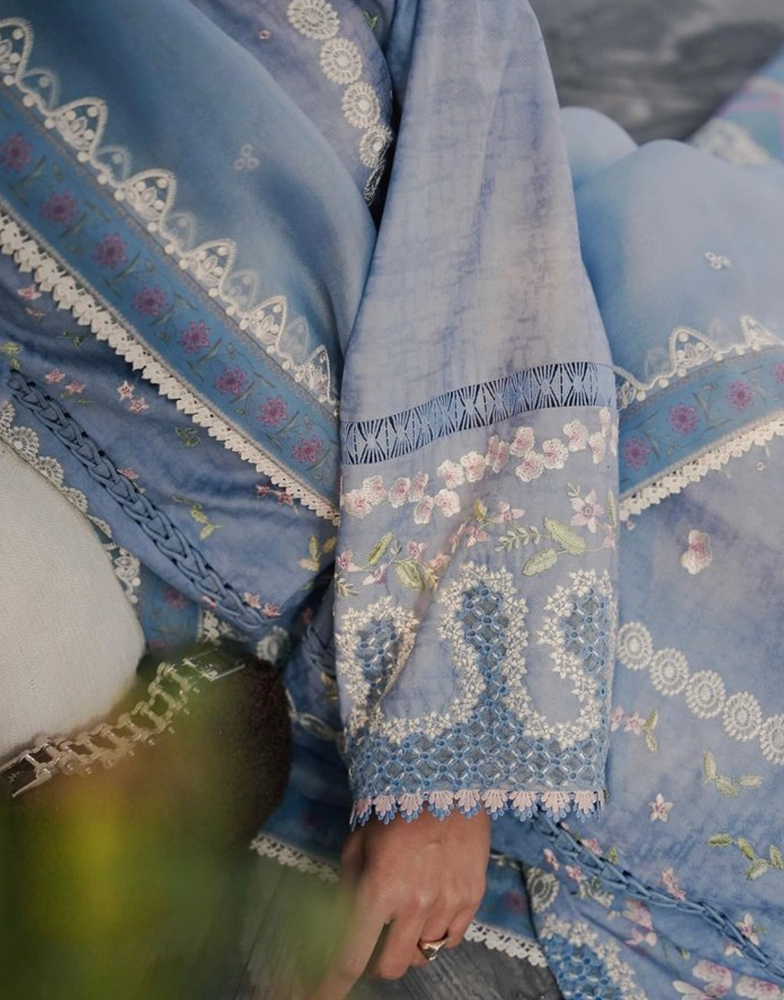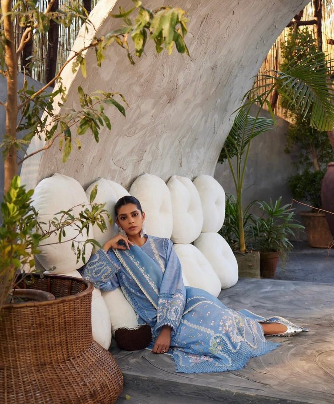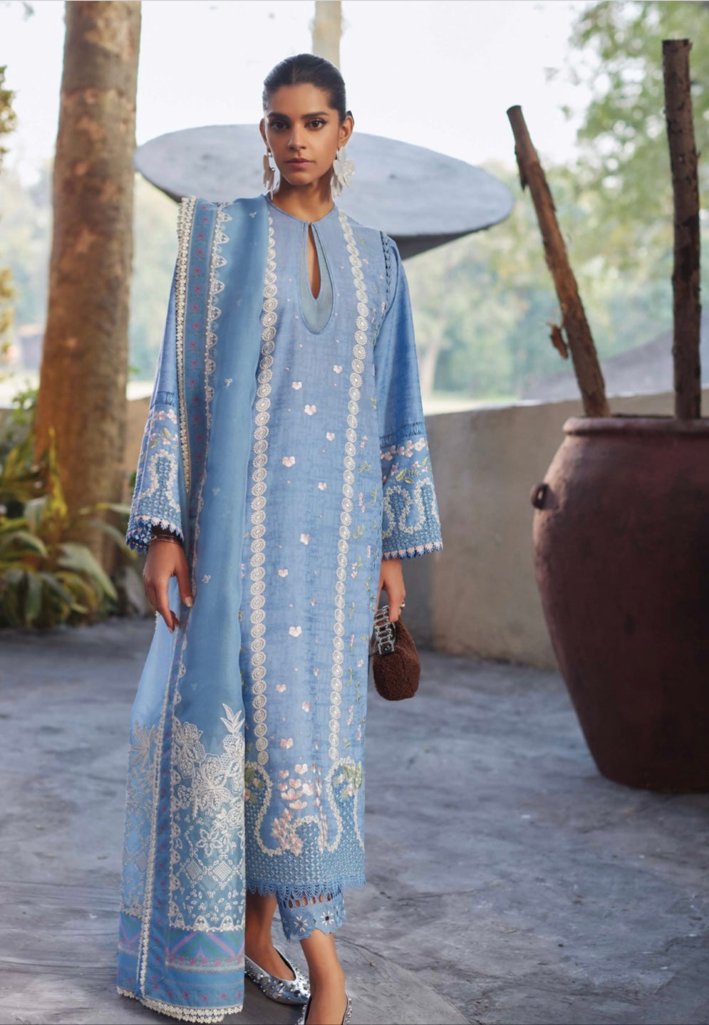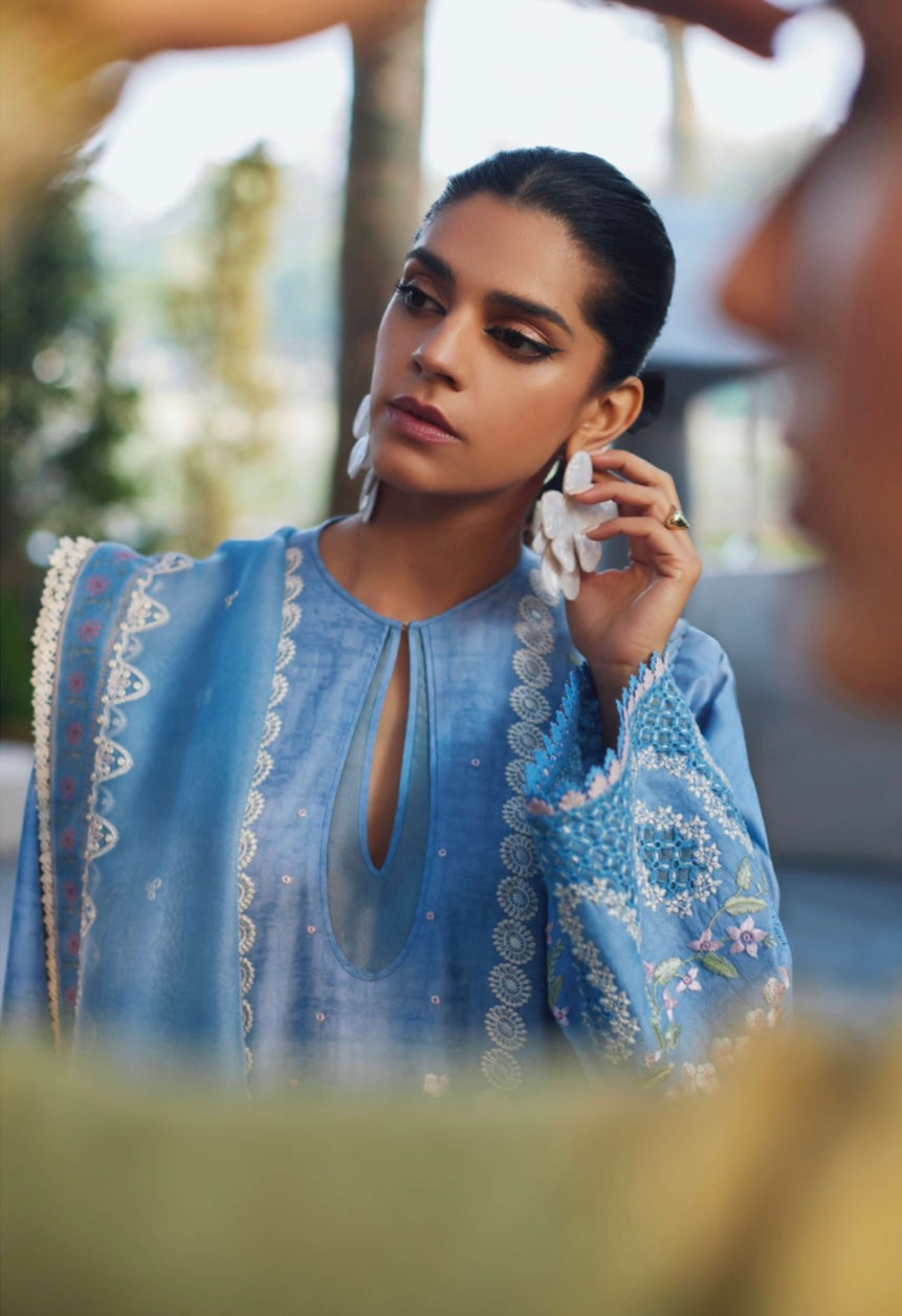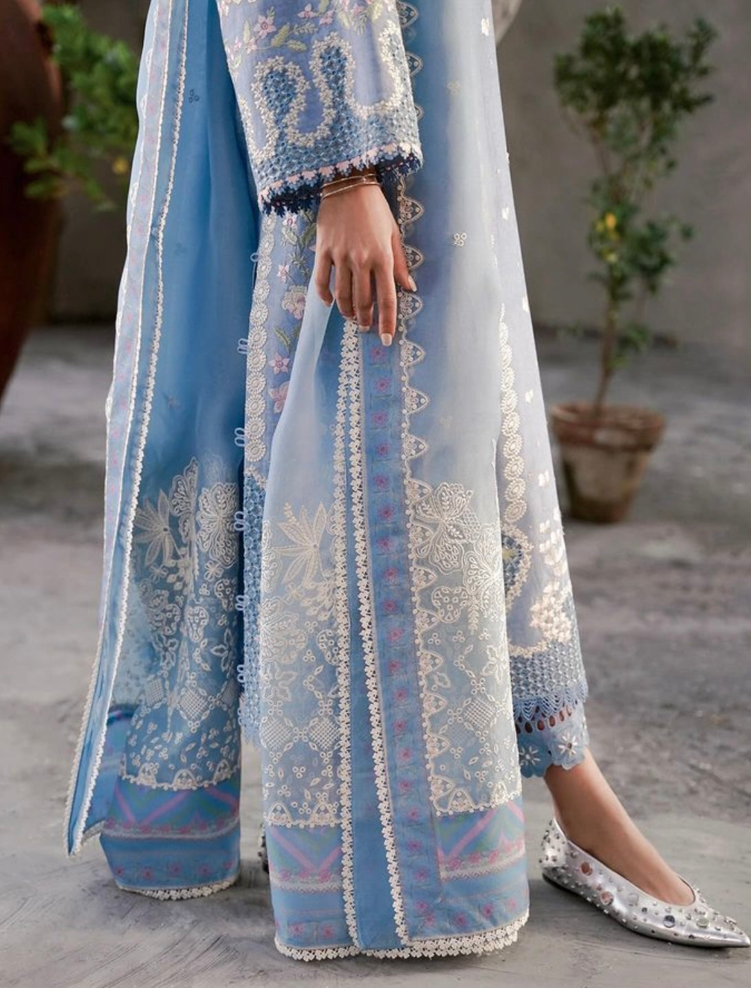 Amani is an ensemble powder blue, box sleeve kurta. This stunning ensemble comes with a round keyhole neckline and is paired with an organza Dupatta adorned with printed and embroidered borders and pallus. The intricate hand made details and laces along with he, and sleeves with jaal adds a touch of luxury to this ensemble. Complete the looks with the straight fit pants and cutwork motifs for the perfect formal attire.