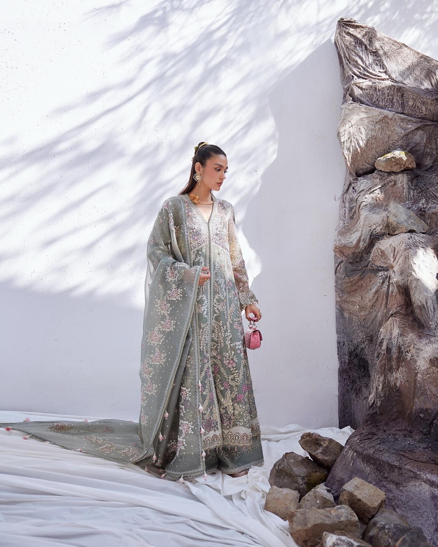 PRODUCT DETAILS ABSHAR 4Pc Stitched A fabulous oyster bay organza green shirt with pink and white embroidery...