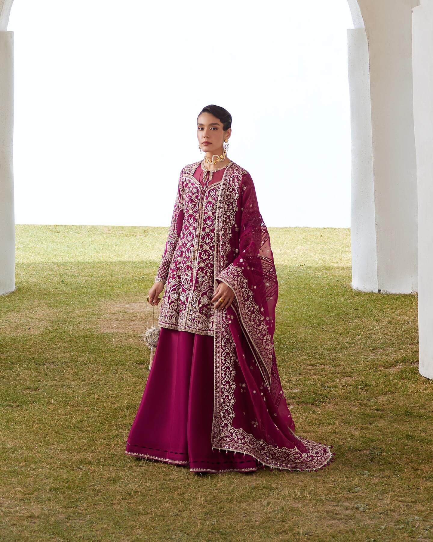 Freeshia RTW’24 introduces in the collection a stunning Berry Plum color, featuring a fully embroided and handworked raw silk peplum shirt with crew neck, keyhole, and fitted sleeves, paired with matching raw silk Sharara pants and a heavy border organza dupatta. Ahlam is an exquisite palette of joy and opulence merged into one outfit.