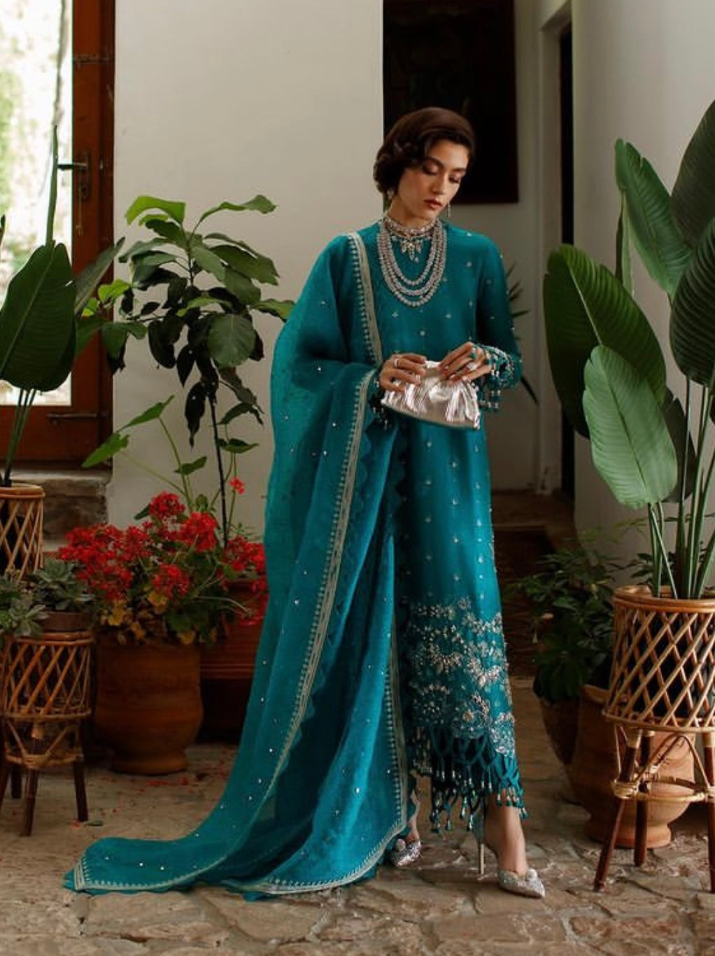 Giselle makes an endearing silhouette with its long silk shirt with dropped corners. The accents of silver are perfectly embellished and embroidered on teal green canvas giving it the marvellous look. Paired along is an embroidered organza dupatta with silver borders adding a charm.