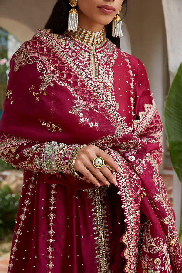 Paired with silk sharara pants with gota lace finishes across trouser hem & organza dupatta with embroidered borders & spray.