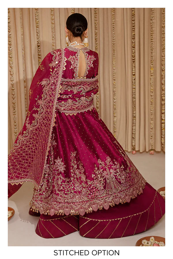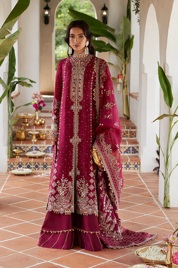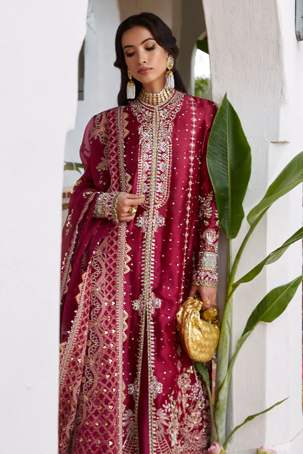 PRODUCT DETAILS Berry pink satin silk organza front open kalidaar shirt with heavy embellishments and embroidery. Paired...