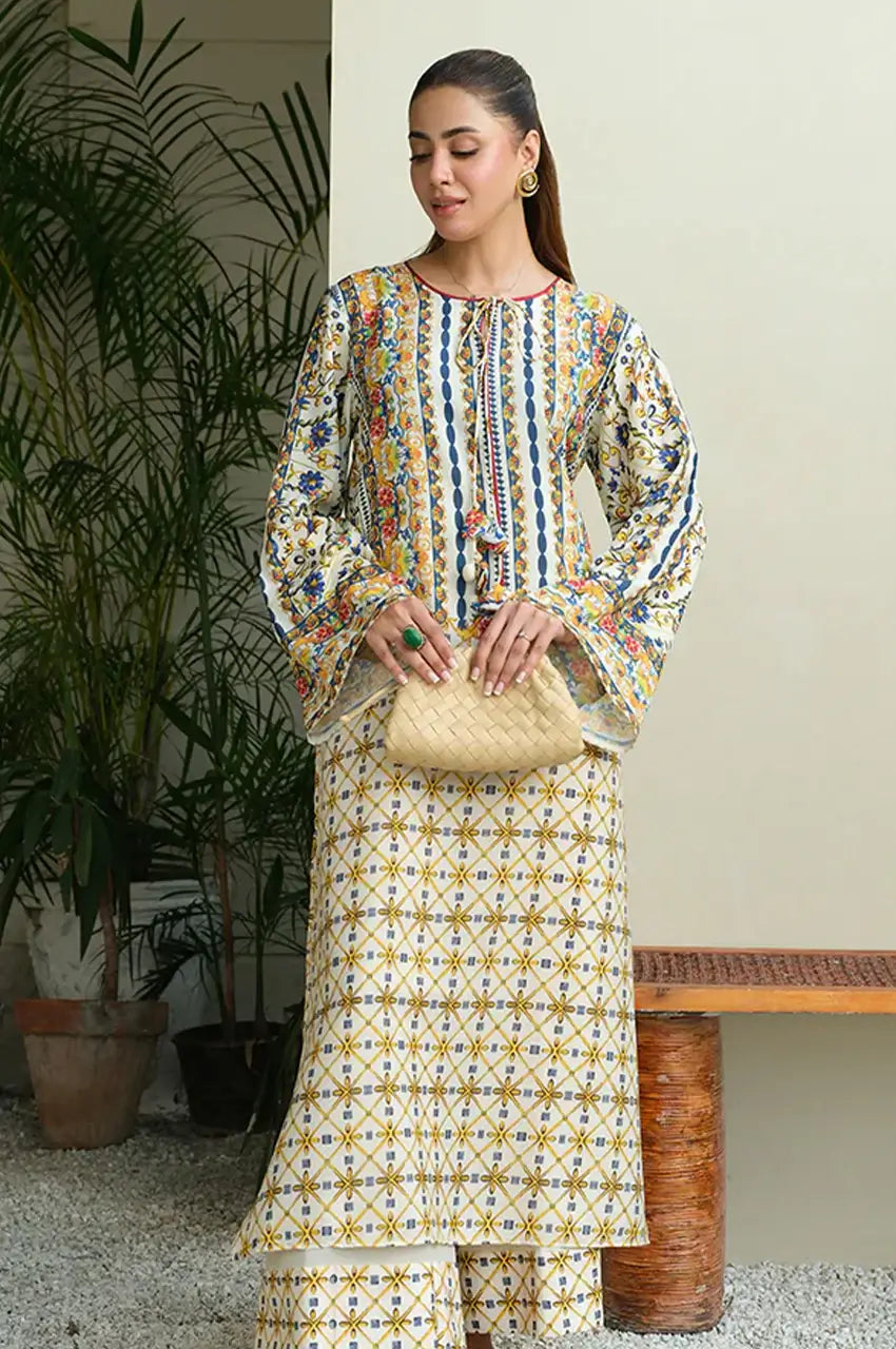 Get ready for fall season with our co-ord set cut from crepe featuring a geometric print in hues of lemon combined impeccably with striking royal blue bits on an ivory base.