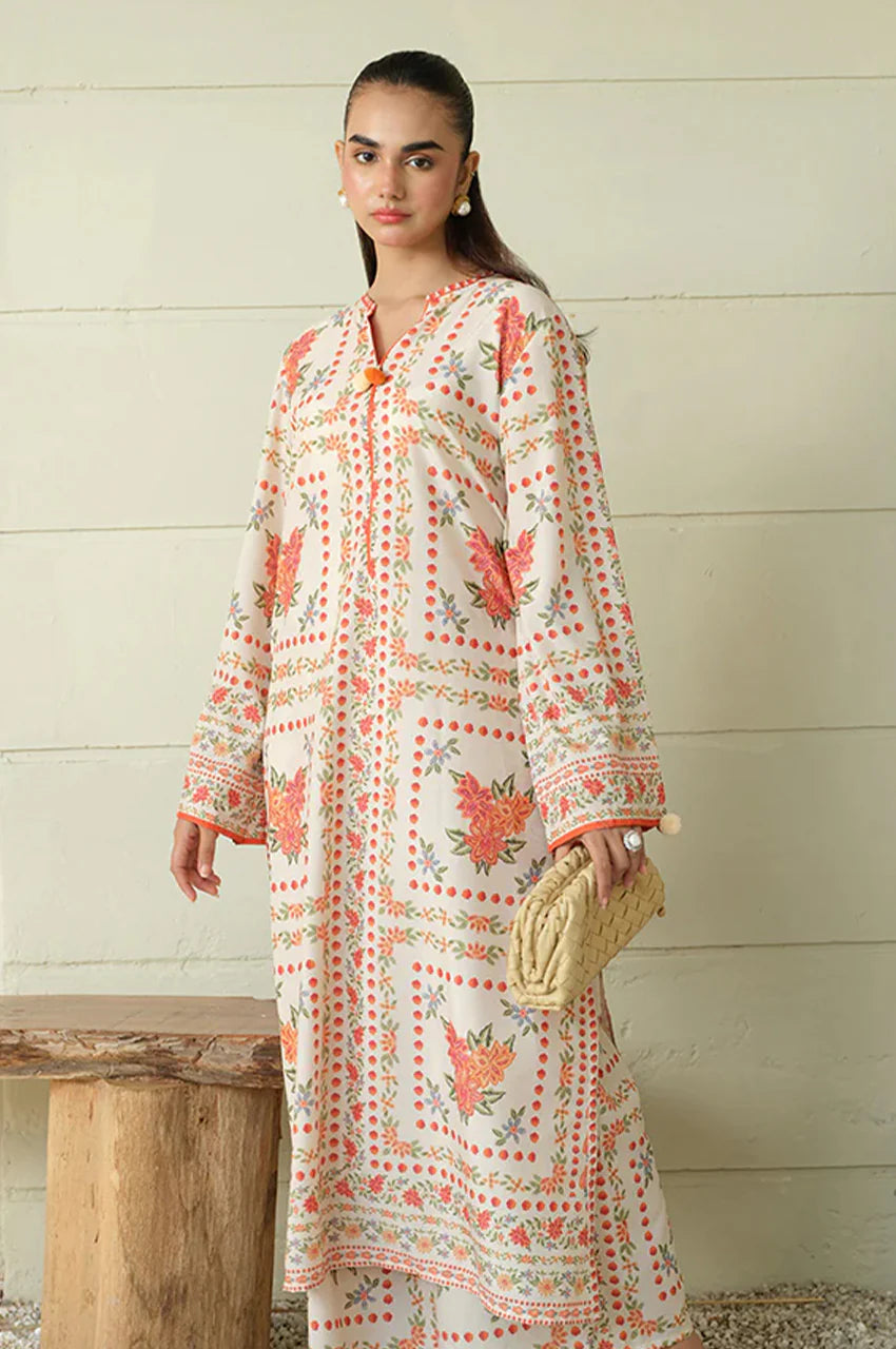 An artfully composed botanical print featuring an ivory A line shirt and loose izar cut from crepe. Striking tangerine hued floral patterns to make you stand apart