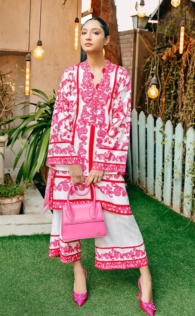 This oh so amazing pink fusion is your summer go to print co ord set. The neck line and sleeves are adorned with cute fan shaped threaded pieces. Paired with loose trousers with beautifully patterned border details.