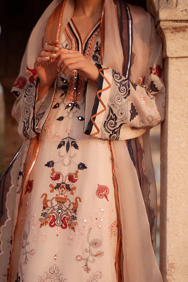 Crafted in soft pink Khaddi Corduroy, this ensemble features intricate machine embroidery, mirror work, and appliqué detailing. Two-tone pleats adorn the hem and sleeves, adding subtle dimension. Paired with a pure organza dupatta adorned with machine embroidery, mirror and appliqué work, enhanced with pleats, pintexes, and delicate gotta finishing for a refined, artisanal touch.
