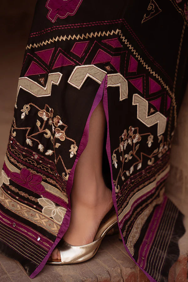 Cut from breathable khadi cotton, this black kaftan is detailed with refined machine embroidery, layered with mirror and appliqué work. Delicate running stitches add texture, while sheesha silk finishing with pintexes brings a subtle structure to the silhouette.