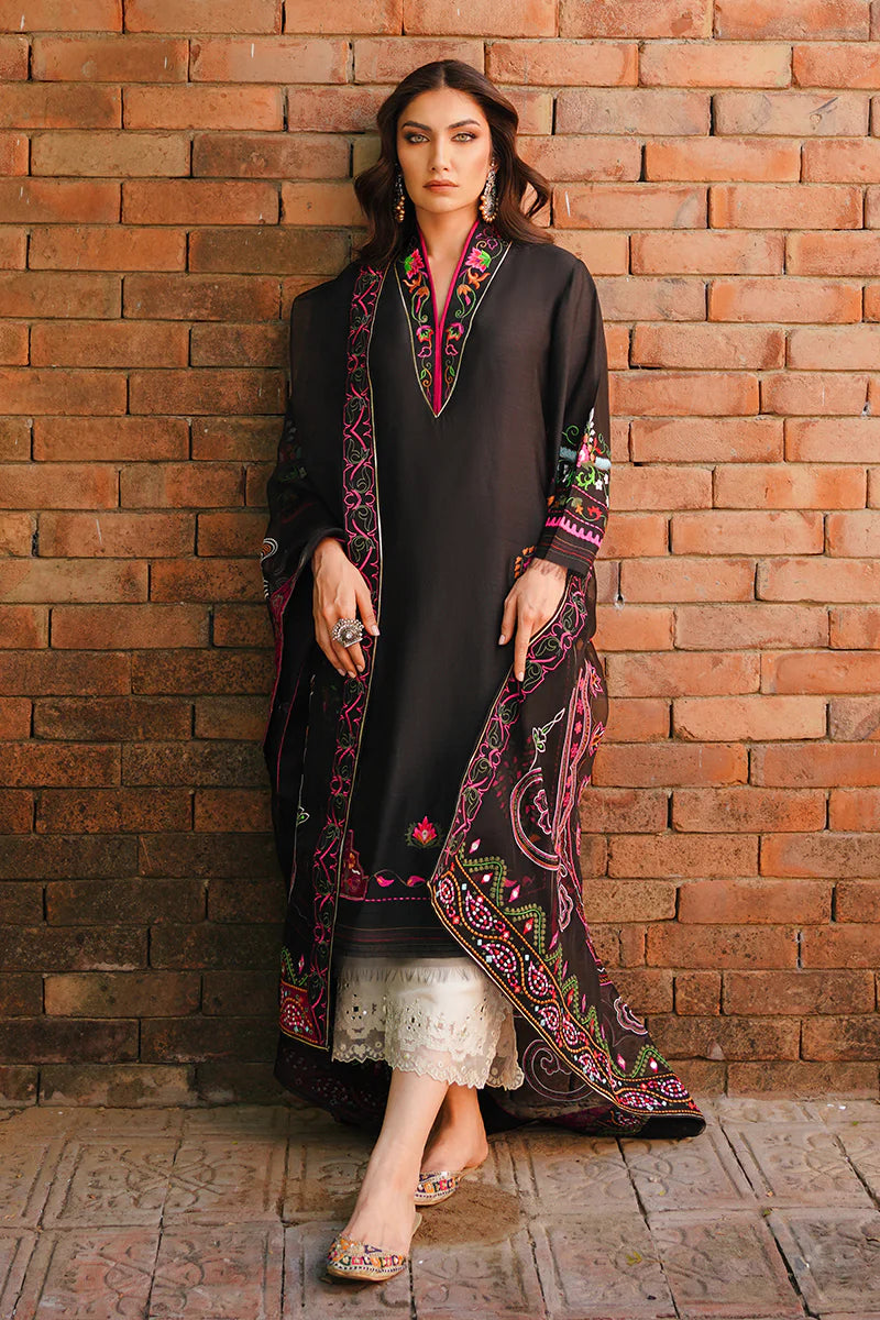 A midnight sky khaadi silk kurta ornamented in machine and ikat style embroidery. Mira exudes sophistication and traditional craftsmanship. Pair this kameez with the organza dupatta made perfectly with colour-blocked borders, making it a go-to ensemble for your delicious Eid dinners