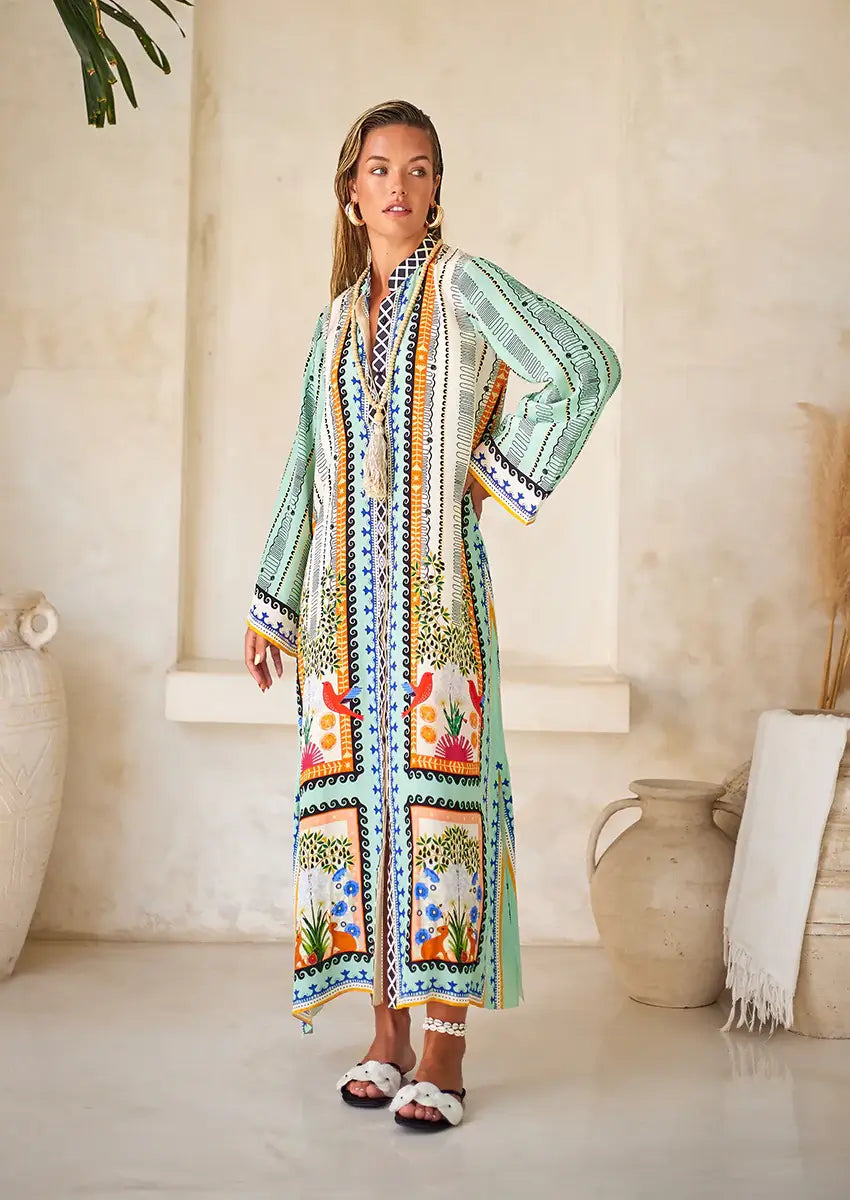 Stand out in a fashion forward mint hued kaftan featuring a signature Tiya print with black and white monochromatic borders. Cut from crepe, its free-spirited vibe makes it ideal for fun-filled days. Dress it up with statement earrings and a snatched ponytail.