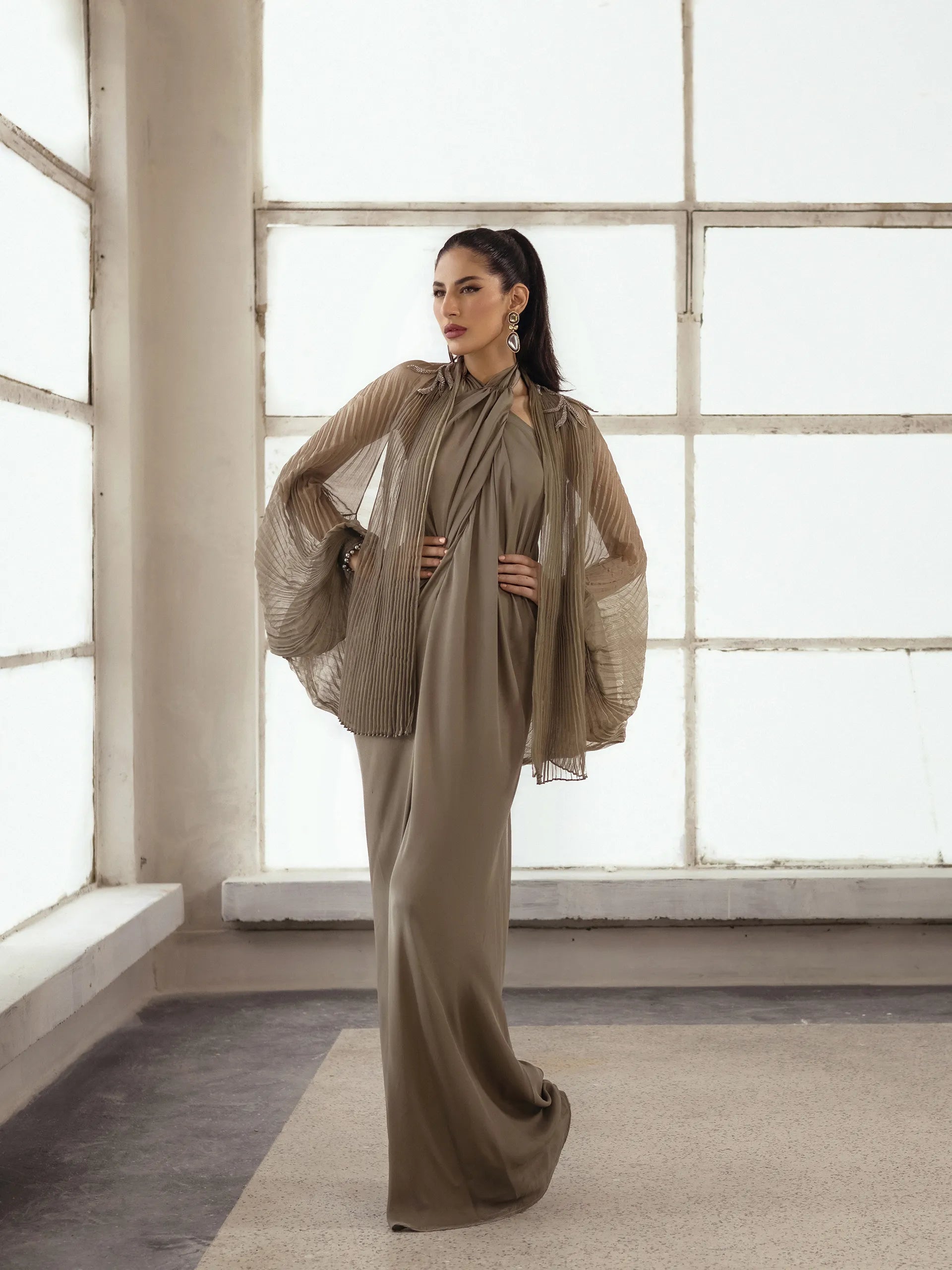 A free-sized pleated chiffon balloon sleeve cape, adorned with a captivating glass bead motif around the collar and delicate pearls on the cuff. Paired with a crisscross charmeuse jumpsuit featuring a luxurious brushed finish.