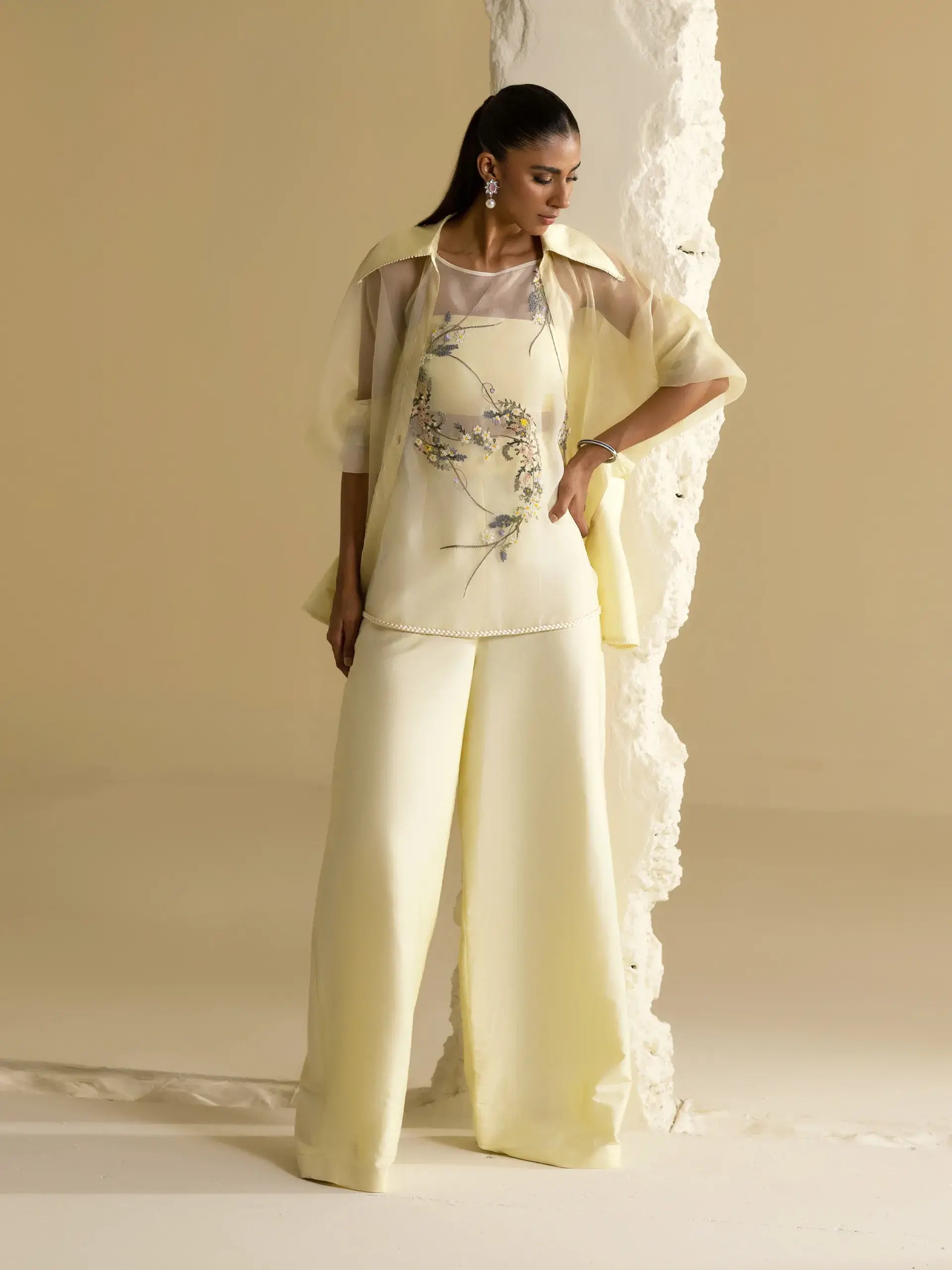 This set features a vibrant combination of pure organza and raw silk embroidered over sized shirt, a halter-cut tank with embroidery, braided hem, and high-waisted trousers for a fresh style.