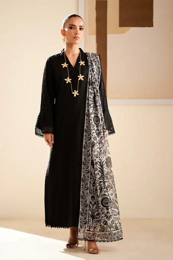 PRODUCT DETAILS 3Pc Ready to wear 3pc Fabric: Silk lawn Embroidered black on black long shirt with...