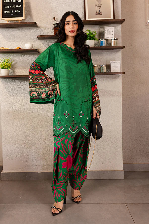 Green floral print short length shirt with embroidery details on neck & daman, paired with shalwar