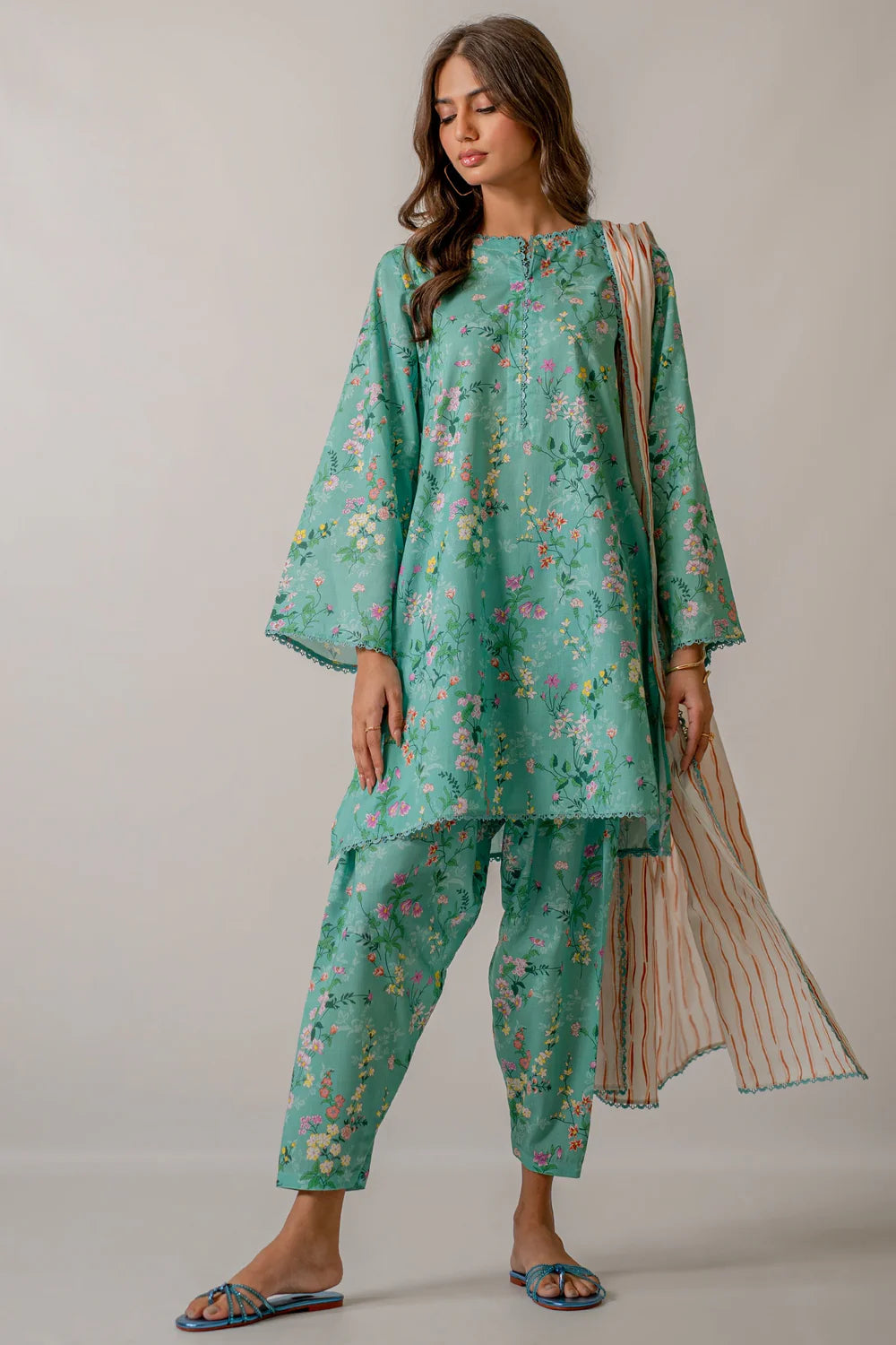 PRODUCT DETAILS 3PC Unstitched This turquoise colored cool print that is soft in the looks and just...