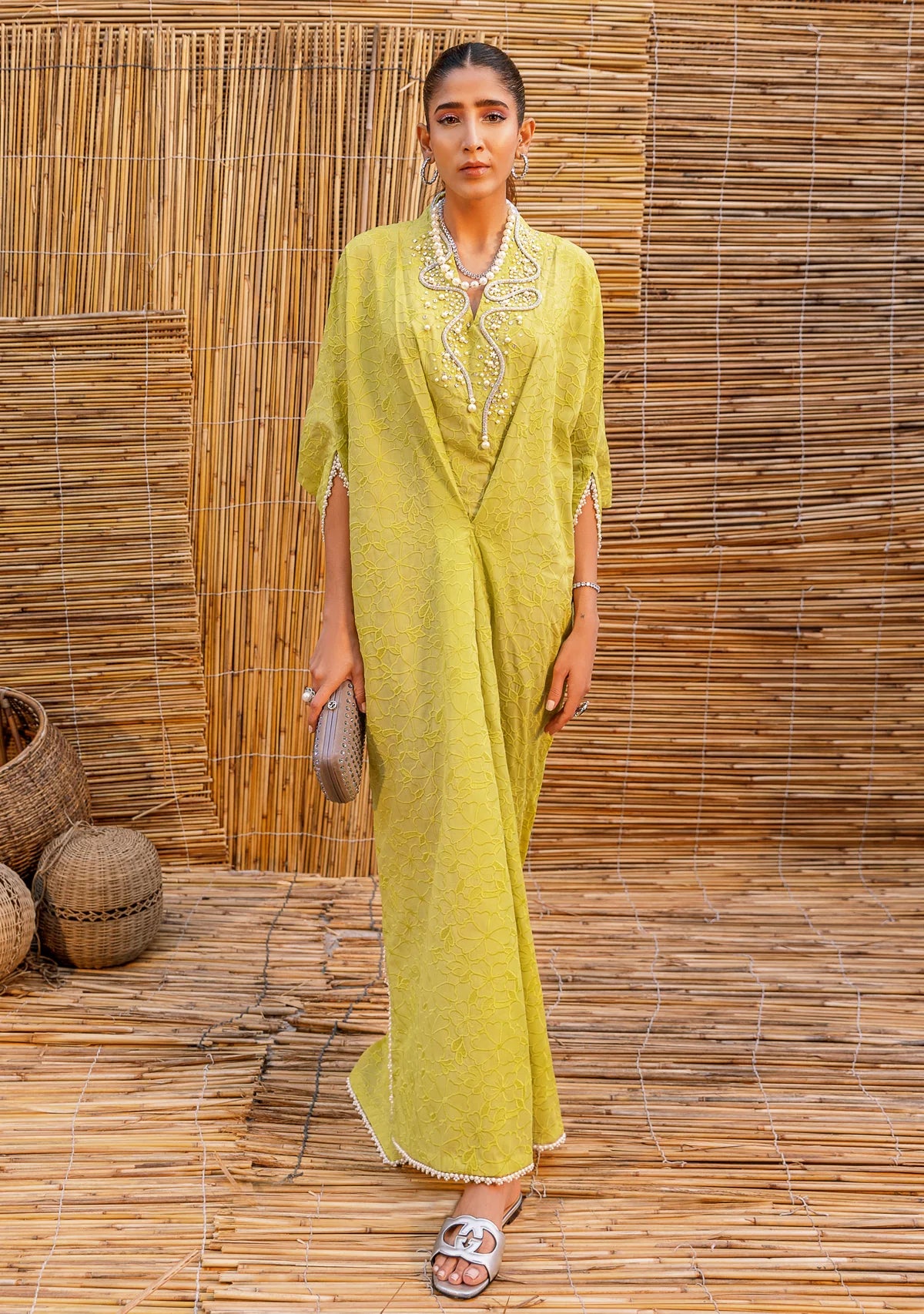 Naz, the chartreuse ensemble is our fully embroidered raw silk kaftaan that comes with a handworked crystal and pearl neckline.