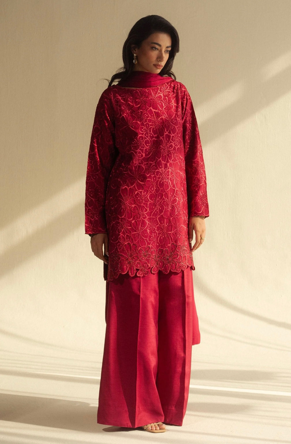 Our berry pink ensemble has embroidered front and sleeves with embellishment on the hem. It is styled loose fit pants and a silk-finished dupatta.