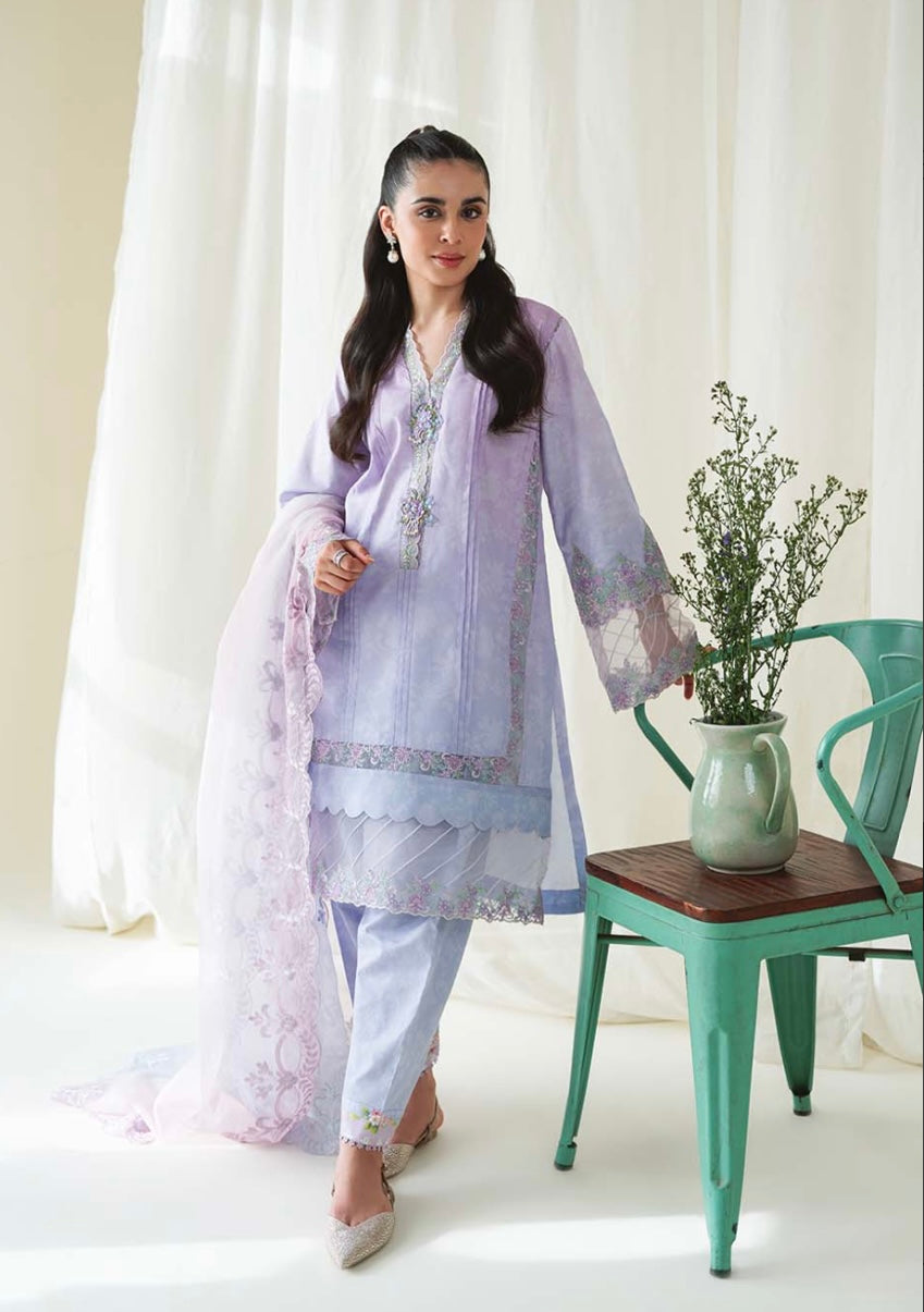 An enchanted garden, “Belle” unfolds on a captivating shaded lavender canvas, where delicate flora gracefully sprawl, revealing hints of ivory, lilac, sage, and periwinkle in harmonious symphony. The intricate embroidery, woven with silk threads, creates a breathtaking composition that evokes the tranquility of a secret garden, comes with self-printed skinny shalwar. Pair it with a shaded dupatta, crafted from soft, diaphanous cotton-net features exquisitely embroidered borders adorned swirling florets. A true masterpiece of artistic expression, it infuses this statement-making ensemble with an irresistible allure, adding an extra layer of sophistication and charm.