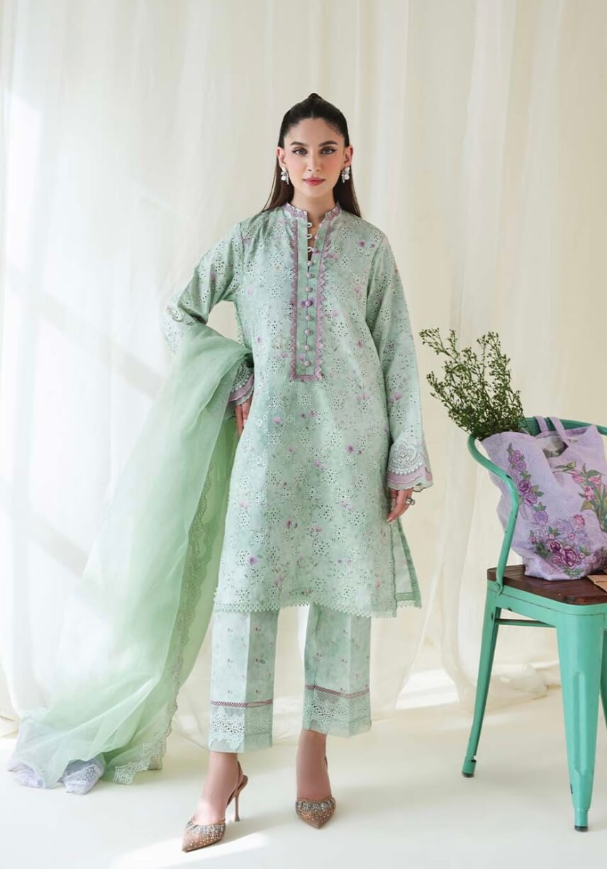Bring a touch of celestial charm of “JADE” to your summer wardrobe.This chic lawn design features an all-over print of flora in mesmerizing cyan hues with subtle hints of lilac, pink and sage all beautifully adorned with intricately detailed tonal embroidery on a cyan canvas. The shirt is adorned with intricate cut work embroidered borders that perfectly complement the summery print, it’s paired with printed pants trimmed with embroidered details. The delicate cotton-net dupatta is finished with intricate borders that perfectly complement the summery print. Lightweight and breathable, “JADE” ensures you to stay cool and comfortable on warm summer days.