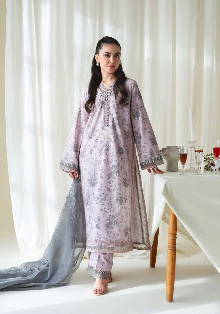 KAYA‘ epitomises ethereal elegance, with its celestial lavender blush canvas providing a sublime backdrop for the dreamy floral prints, blooming in shades of grey, accented with subtle hints of charcoal. Delicate thread embroidery intertwined with laces throughout the design further enhance its sense of sophistication, paired with a tonal printed trouser.The relaxed silhouette embodies a seamless fusion of tradition and modernity, offering a statement of chic vibrancy and effortless grace. Complete the ensemble with a stunning embroidered dupatta rendered in a contrasting soft charcoal hue. “KAYA” is the epitome of summer chic, promising to captivate with its celestial allure wherever you go.
