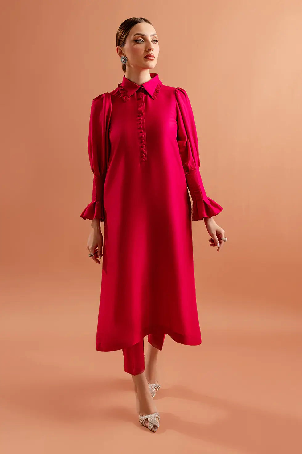 PRODUCT DETAILS 2Pc Ready to wear Color: Hot Red Fabric: Pure Silk