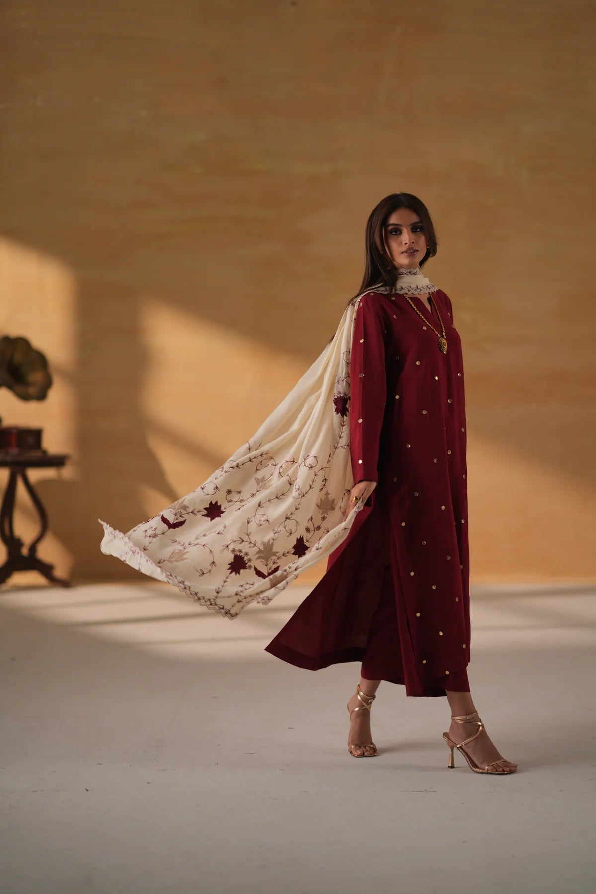 The design of this maroon outfit is both classic and timeless, featuring an elegant sitara spray. The sitara work is thoughtfully integrated into the design, highlighting the shirt. The embroidered dupatta is adorned with appliqué work, adding depth and texture to the ensemble. The deep maroon color enhances the richness of the outfit, making it a versatile choice for both day and evening events.
